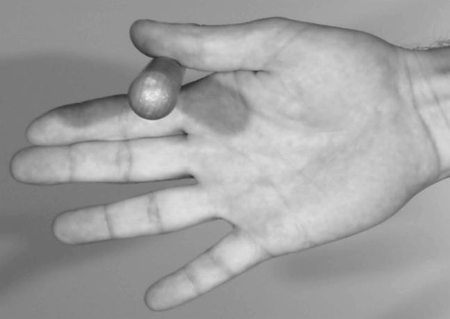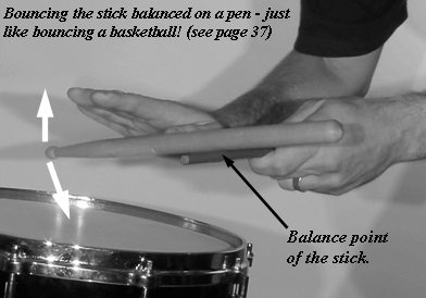 Holding the stick exactly at this correct balance point is very important, as it determines how easy it is to bounce the stick with the fingers, and it also means that there will be no extra stresses on the fulcrum. Remember that with the corect spot the stick needed no grip at all, but with the wrong spot the stick was jumping off the pen - we don’t want that jumping between our fingers!