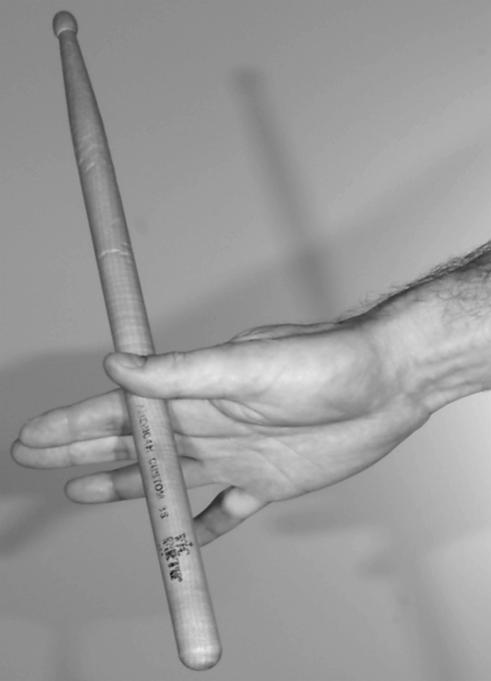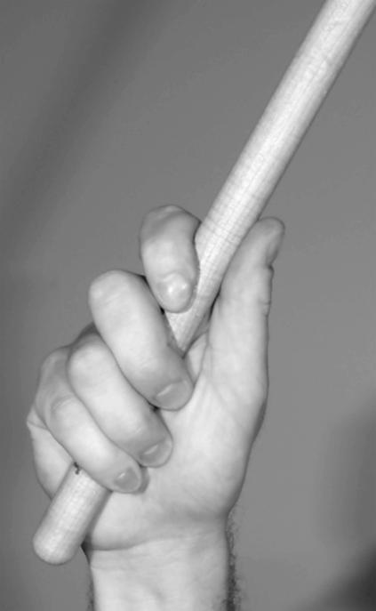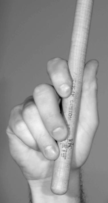 Even though this sounds like we are using two quite different techniques, in practice, this is not really so. Remember that when we are using the fingers to propel the stick and bouncing it, even though the shaft is on the thumb side of the groove of the hand, it is not actually coming right into the palm and making contact. When we wrap all the fingers right around the stick, we are not using the fingers anyway, so it does not matter that their direction of movement (because they are not moving) doesn’t line up with that of the wrist.