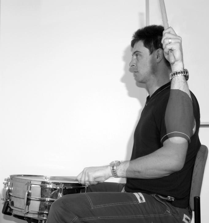 As mentioned on the previous page, piston strokes can be played at any level of volume - the higher they are, the louder. Because they bounce back to the same height, the volume of notes will remain the same. The two extreme versions of the piston stroke are the softest possible - played from the wrist, and the loudest possible, played from the elbow. These are the ones that we must know well, to practise rudiments etc to their maximum potential. We will call a soft piston stroke a “TAP” stroke,and a loud piston stroke a “FULL” stroke.